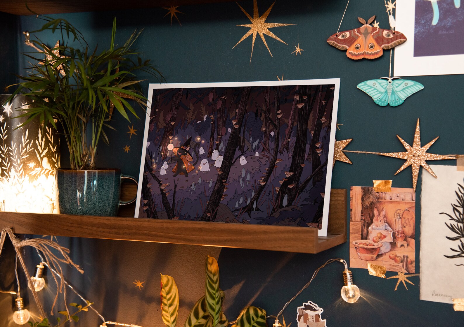 This Haunted Forest Halloween print depicts a little witch cat charming ghosts in the spooky woods! The illustration has a lovely storybook-esque finish and would make a lovely addition to an art wall or a bedroom!