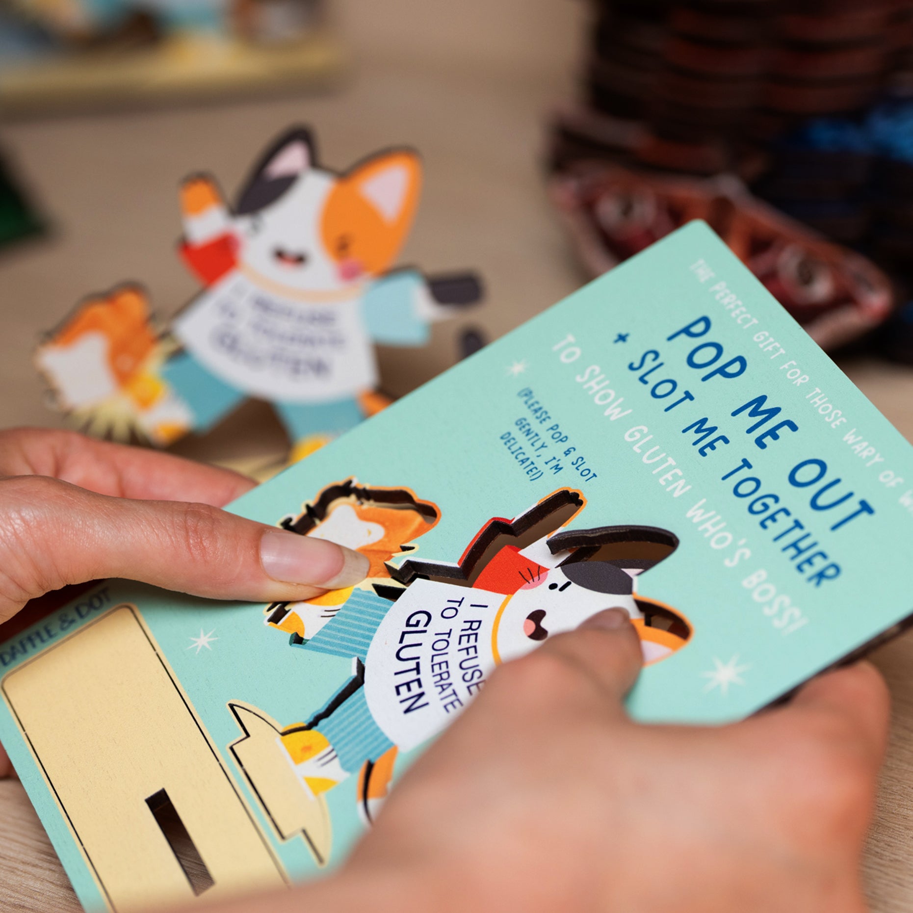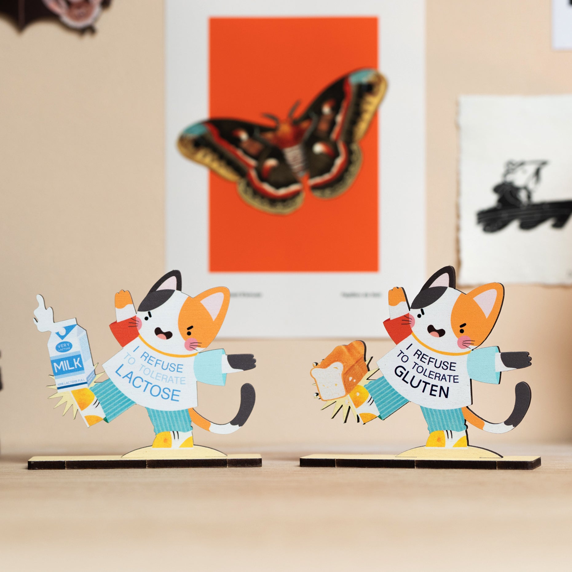This little cat measures 9.5cm tall and 11cm wide, and comes on a pop out wooden sheet ready to assemble. Simply pop out each piece, gently slot together and place him on your desk or workspace. He is made from sustainably sourced wood, and printed with UV sealed inks that will last for years to come. Please note that the pieces are designed to fit snugly, so please be careful when slotting pieces together; wiggling is your best bet to avoid breaking thin or delicate parts.
